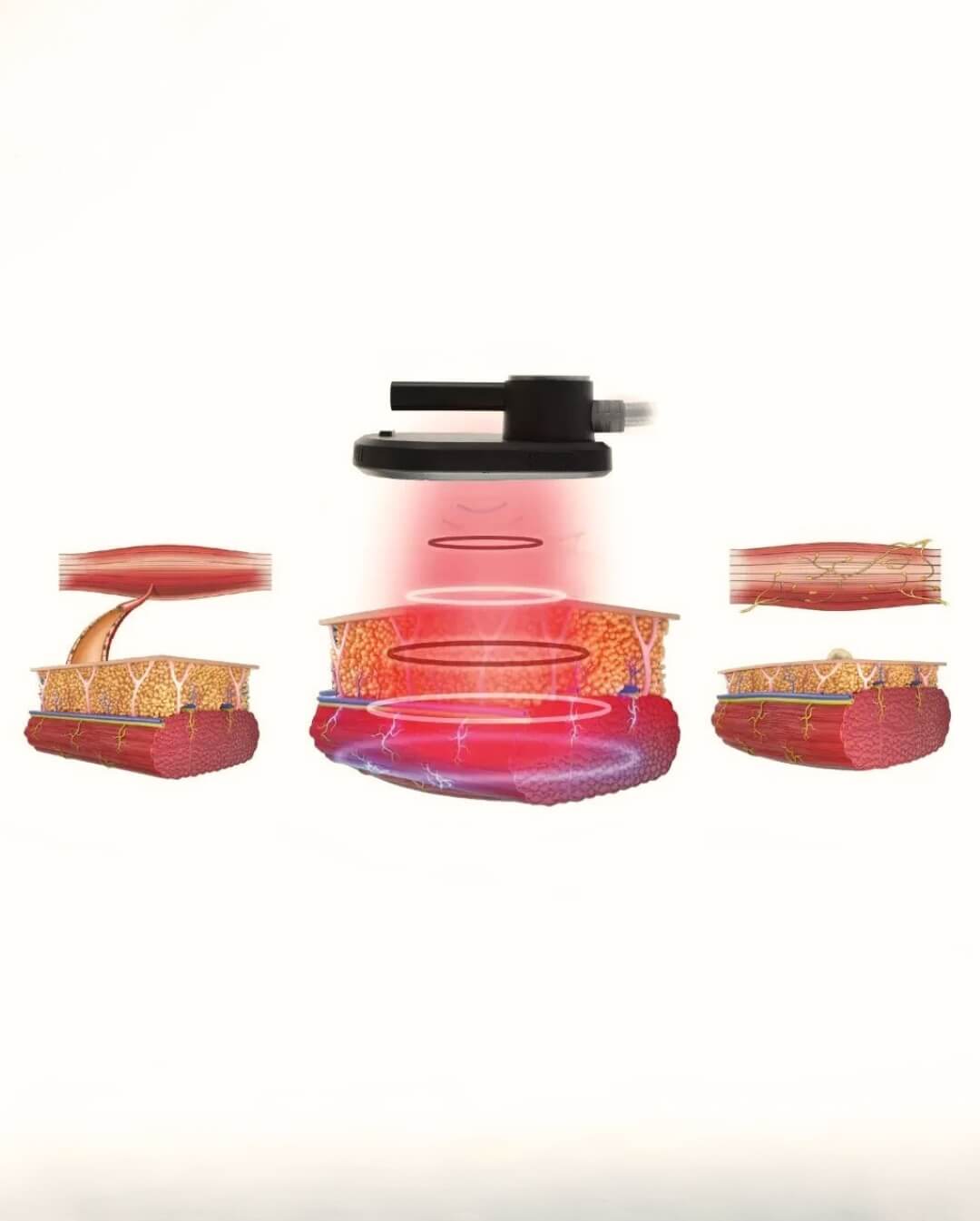 RF energy heats fat cells and tightens tissue, while HIFEM stimulates muscle fibres for hypertrophy and hyperplasia.